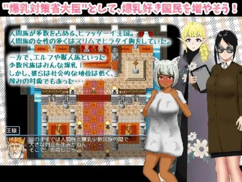 ★剧情人族占多数的喜拉塔伊王国。人族的女性大多拥有修长的胸部。另一方面,精灵和兽人族这样的少数民族全都爆乳!但是他们的社会地位很低,也是被轻视的对象……★内容突然被国王任命为”爆乳对策省大臣”的大臣!爆乳”性”策(AV摄影)增加喜欢爆乳的国民!通过在街上的调查(与主要角色、居民的对话、购买道具)取得动画的提示,进行爆乳动画摄影(H场景回收)吧!爆乳AV片段·揉奶采访·派兹利(很多!)·SEX(正上位·骑乘位·背后位)·其他,逆兔、修女、转子、等等★音量H场景数:28(相同基本CG数)·预设游戏时间:90-120分钟左右(回想房间从玩儿的途中变得能去。全场景解放有)