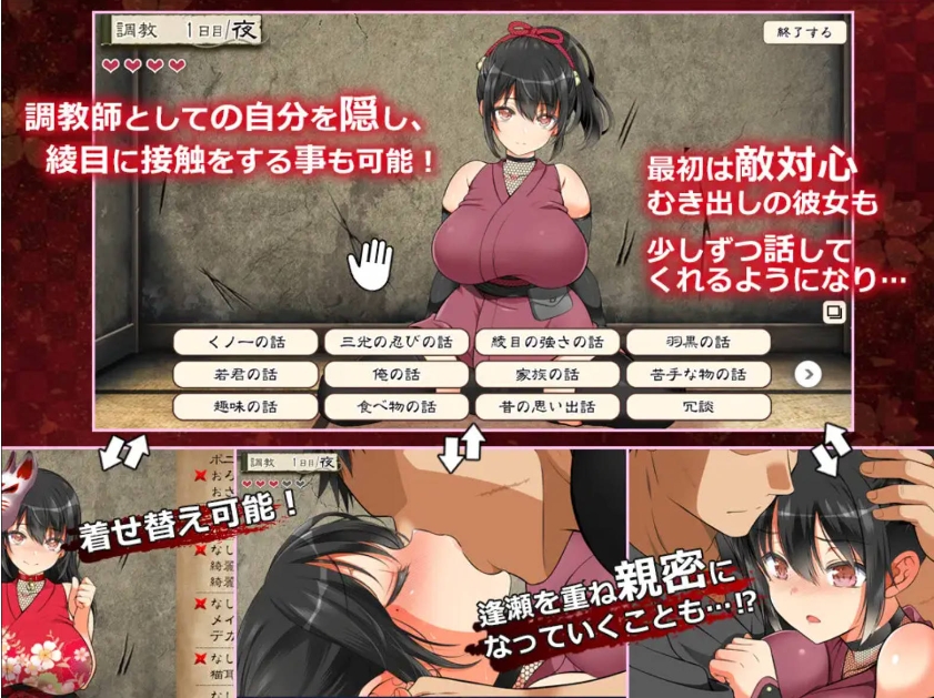 -游戏对女主的条教分为:“侍奉”、“凌褥”、“耻褥”三个主大项,每个大项内分为四个具体条教项目,根据开始选择的大项,游戏会进入具体的分支进展路线,从而影响后面的条教内容和结局。