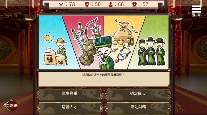 在游戏中每个月可以决定两项国家政策,三项培养刘婵的安排。