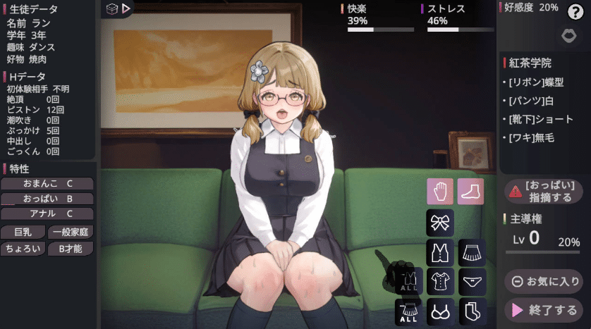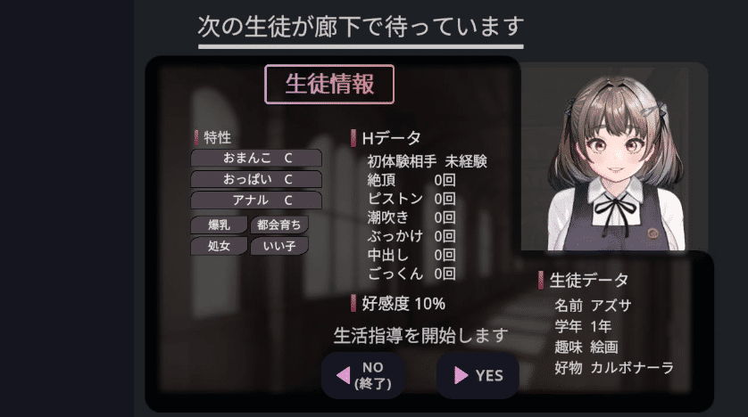 游戏中,随机生成的学生会来到理事长室。这些学生中可能会出现扶她、喷乳、甚至亚人等特殊角色。玩家需要将学生的行为与校规进行比对,通过指出违规行为来推进故事发展。