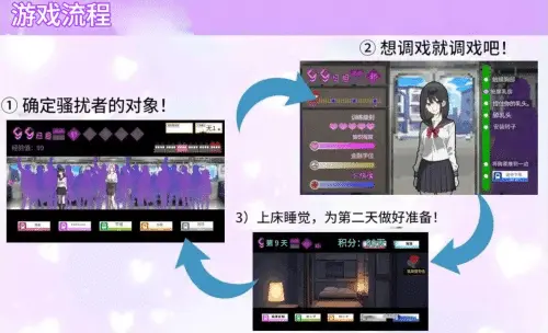 游戏内设有“早上”、“傍晚”、“夜晚”、“深夜”四个时间段,以及“平日”和“休息日”两个日期类型,根据这些条件,出现的女主角也会有所不同!