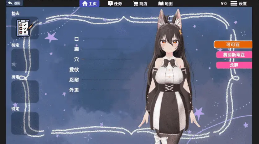 游戏支持英语和中文。游戏只支持Window,不支持Android、iOS和VR游戏玩法:点击角色的手,将她带到指定的地方,然后进行互动。游戏里所有的衣服、头发、胸部的物理效果都是实时生效的!推荐使用3D性能比较好的Window系统电脑进行游戏,由于游戏使用卡通渲染,相对来说对显卡要求较低。